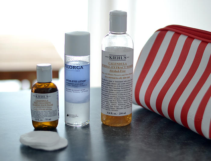 Išvažiuojant kelioms dienoms, tikrai nereikalinga krūva prausiklių, šveitiklių ar kaukių. Akių makiažo valymui renkuosi Filorga optim-eyes lotion. Kol nepabandžiau šio – draugavau su miceliniu vandeniu, tačiau šis valo geriau, visiškai nedirgina akių (maniškės labai jautriai reaguoja į visokius akių makiažo valiklius) ir dar rūpinasi paakių oda ir blakstienomis (čia man buvo naujiena, kad tokių valikių išvis yra). Nesausina, neriebina, bet palieka labai gerą jausmą, kurio net nesinori nuplauti. Visą kitą veido makiažą man puikiai padeda nuplauti Kiehl’s Calendula deep cleansing veido prausiklis, ir veido valymą užbaigia ir pradeda drėkinimo procesą tos pačios linijos Kiehl’s tonikas. Šį toniką labai labai mėgstu, kaip matote, jo likę mažiau nei pusė butelio. Maloniai valo ir drėkina odą, palikdamas labai gerą jausmą (nesausina, nes neturi sudėtyje alkoholio) ir puikiai paruošdamas veido odą tolimesniam serumų ir kremų maratonui.