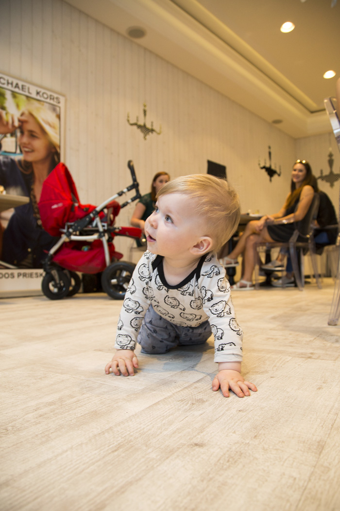 Veiksmas vyko Dine restorane, jame teko pabuvoti pirmą kartą, tačiau atmosfera labai labai patiko jau iš pirmo žvilgsnio. Gaila, kad šią neįtikėtinai karštą dieną teko prakaituoti ir vaikantis po visur Gabrielių – kai veiksmas vyksta dienos metu, imti vaiką su savimi ar neimti – tokio pasirinkimo tiesiog neturiu. Kol merginos mėgavosi maistu, klausėsi prezentacijos, fotografavosi selfius ar darė kadrus savo instagram paskyroms, pačios mėgino pakeisti Daniel Wellington laikrodžių apyrankes (ką, pasirodo, visai nesudėtinga padaryti), aš tiesiog buvau mama, o ne blogerė. Informacijos klausiausi viena ausimi, žavingus užkandžius susimečiau į skrandį net nespėjusi jais pasimėgauti, ir visaip bandžiau mažylį užimti, kad jis netrukdytų visiems susirinkusiems. Tokia jau ta blogerės/mamos kasdienybė, tačiau aš džiaugiuosi kiekviena akimirka. Kartais būna sunku, ir į renginius tikrai kartais labiau norisi važiuoti vienai, tačiau iš kitos pusės, džiaugiuosi, kad Gabrielius nebijo žmonių susibūrimų, nekelia isterijų ir pratinasi bendrauti.