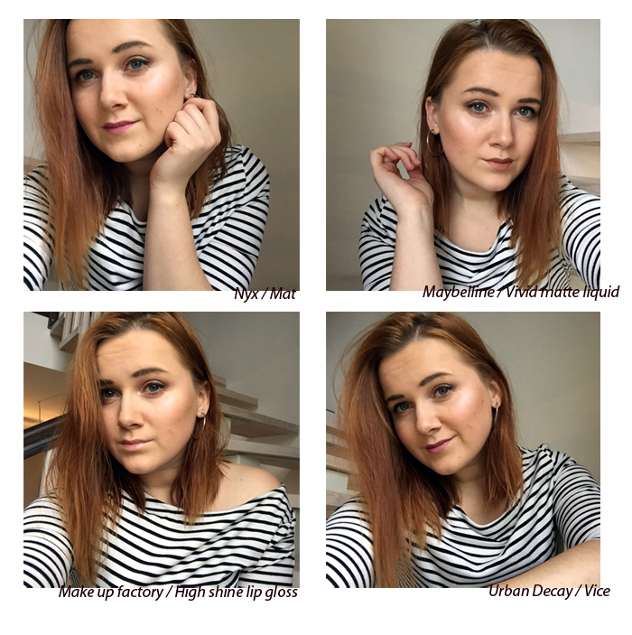 O štai kaip jie visi atrodo ant manęs. Šiandien žaidžiau dažymosi ir valymosi žaidimą, todėl vieta ta pati, rūbai tie patys, ir makiažas tas pats. Jeigu įdomu, kokias priemones naudojau makiažui, žiūrėkite mano instagram. Kurių lūpų dažų bėgsite ieškoti sau?:)