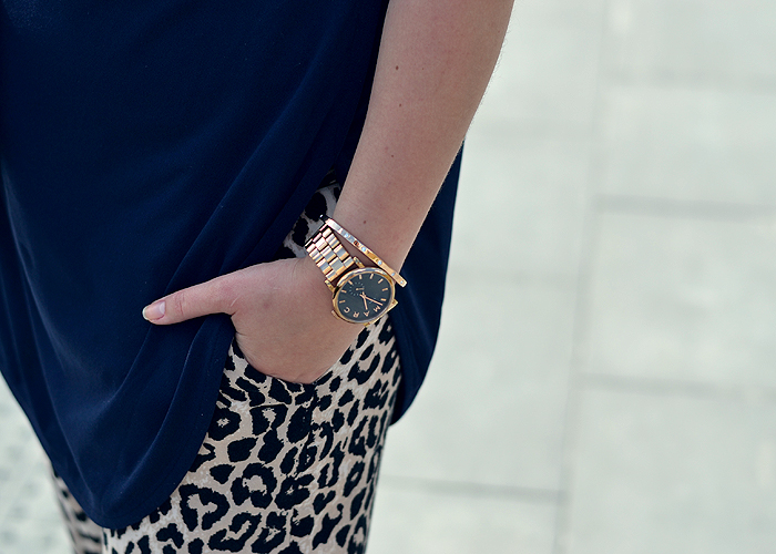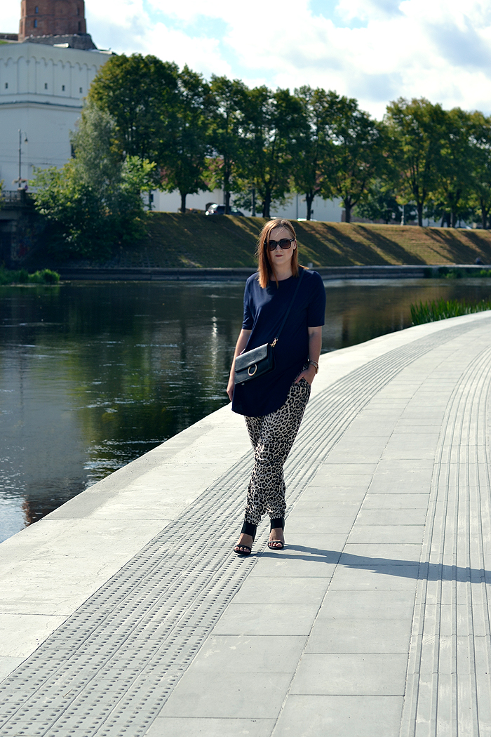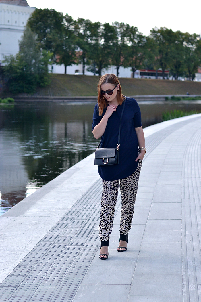 Visada mėgau gyvūnų raštus, nesvarbu ar jie buvo tendencijų topuose ar ne. Aišku, ne visur, ne visada ir ne bet koks gyvūno raštas yra gražus ir skoningas. Mano mėgstamiausios turbūt yra nespalvotos šių raštų interpretacijos drabužiuose ir avalynėje – jos tokios ryškios ir traukiančios akį! Šiam deriniui išsitraukiau iš spintos gilumos senas Lindex kelnes, kurias labai mėgau prieš kelis metus, ir kurias mielai nešioju iš šį sezoną. Trumpa juoda palaidinė šiame derinyje būtų buvusi per daug įprastas ir saugus pasirinkimas, todėl norėdama kažko įdomesnio, pasirinkau tamsiai mėlyną itin ilgą palaidinę. Leopardinis raštas gali būti labai skoningas, ir tai įrodysiu jau greitai pasirodysiančiame blogo poste su pirkinių rekomendacijomis! Stay tuned 🙂