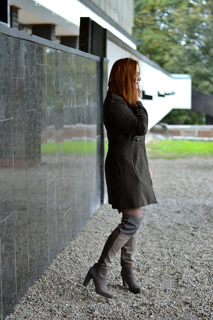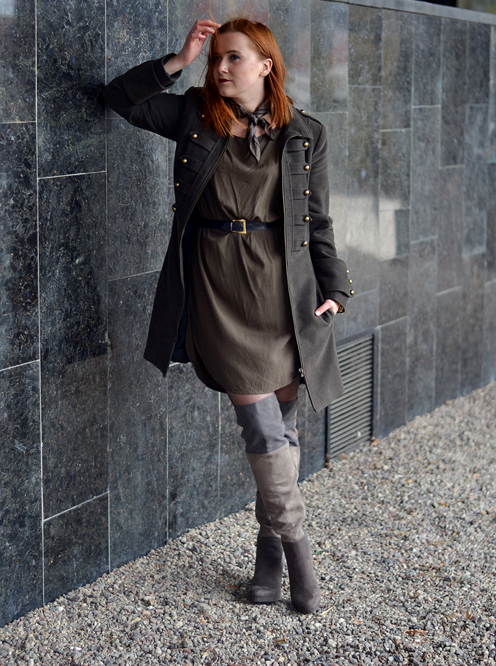 Šis derinys turbūt taps vienu iš šio rudens favoritų. Nerealūs Tamaris batai virš kelių (suuuper patogūs, nors nėra žemi, net nustebau!), chaki spalvos Lindex suknelė (kurios turbūt nebėra pardavime), bei prie jos derantys : paltas ir skarelė. Norėjau trumpai pakalbėti apie šiuos Tamaris batus. Galėtų atrodyti, kad tokia neutrali spalva (spalvos) prie visko tinka, tačiau jeigu norisi, kad batai taptų tokia pat svarbia derinio detale kaip ir visa kita (o ne kad tiesiog užsidėjau batus kurie neatrodo blogai, bet ir nieko gero neduoda), tai teks šiek tiek pavargti. Jie šalia savęs mėgsta šaltus pilkus/rusvus/žalsvus tonus, kitu atveju atrodo gana keistai. Turbūt šis dalykas galioja ir bet kokiai kitai šių spalvų avalynei, bet čia tik mano nuomonė:)